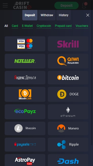 نظام الدفع في كازينو دريفت جيد، إذ يقبل الموقع الإيداع والسحب عبر بطاقات Visa وMasterCard وMaestro وMoneta.ru وInterkassa وYandex وLiqpay وSkrill وNeteller وPaysafecard والتحويل البنكي. أوقات الدفع أبطأ قليلاً من المتوقع، ولكنها ليست بطيئة للغاية. يتعامل الكازينو مع سوق المراهنات الروسي، مما قد يُفسر بعض القيود هنا.