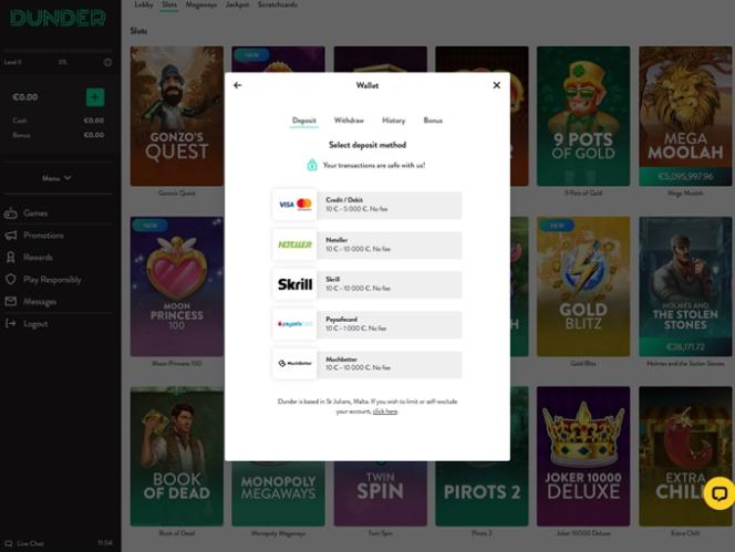 خيارات الخدمات المصرفية في Dunder Casino