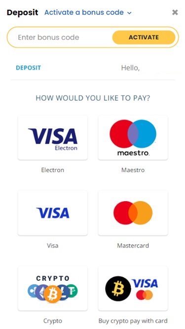 من عوامل الجذب الأخرى لهذه العلامة التجارية للكازينو توفيرها طرق دفع متعددة للإيداع والسحب. يمكن للمقامرين استخدام الطرق التقليدية مثل ماستركارد ، وفيزا ، والتحويل البنكي ، ونتلر ، وسكريل ، وباي سيف كارد ، ومينفينيتي . كما تتوفر العملات المشفرة مثل بيتكوين ، وبيتكوين كاش ، ولايتكوين ، وإيثريوم ، و USD Coin ، وتيثر ، مما يوفر معاملات أكثر سرية وسرعة.