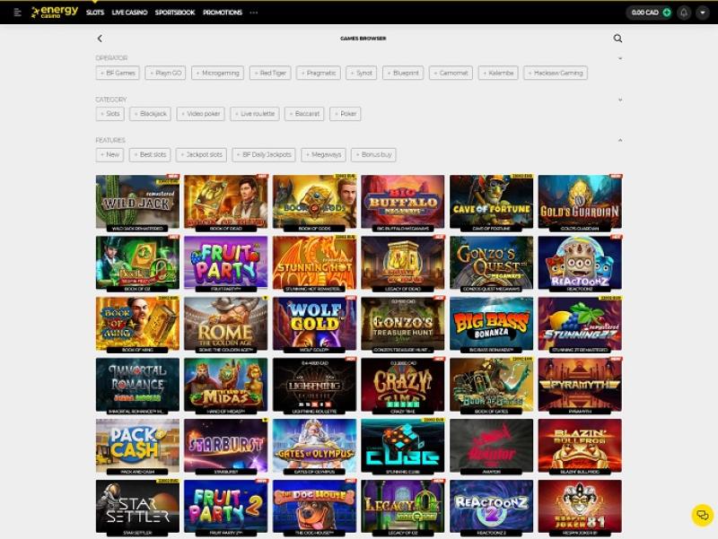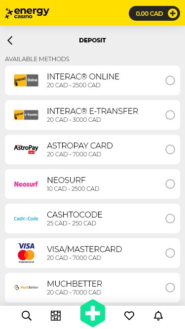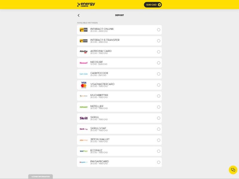 كازينو إنرجي مدعوم بواسطة Microgaming, Net Entertainment, 1x2gaming, Big Time Gaming, ELK Studios, Evolution Gaming, EYECON, Ezugi, Novomatic, Oryx, Play'n GO, playson, Relax Gaming, Thunderkick, Wazdan, Betgames, Booming Games, Stakelogic, Pragmatic Play, Nolimit City, Red Tiger Gaming, Spinomenal, Red Rake Gaming, Fantasma Games, SYNOT Games, Kalamba, Spin Games, Skywind, Spinmatic, Triple Edge Studios, Stormcraft Studios, Switch Studios, Electric Elephant Games, Pocket Games Soft, Bulletproof Games, All41 Studios, Gluck Games, Gameburger Studios, Slot Factory, Neon Valley Studios, Swintt, SpinPlay Games, HungryBear Gaming, Blue Guru Games, On Air Entertainment, Holle Games, Buck Stakes Entertainment, Games Global, Wizard Games, 2by2 Gaming, Ainsworth, bluberi, Blueprint Gaming, GamesOS, Greentube, Leander Games, Merkur Gaming, Pariplay, Gamomat, Reel Time Gaming, BF Games, Bally Wulff, Iron Dog Studio, Foxium, Just For The Win, Storm Gaming Technology, PearFiction Studios, Wild Streak Gaming, Slingshot Studios, Golden Hero, Fortune Factory Studios, Jade Rabbit Gaming, Green Jade Games, STHLM Gaming, RubyPlay, 4ThePlayer, Gamevy, Crazy Tooth Studio, NetGaming, High 5 Games, Japan Technicals Games, Alchemy Gaming, Black Pudding Games, Snowborn Games, Hacksaw Gaming, Max Win Gaming, Gold Coin Studios, Half Pixel Studios, Slotmill, SilverBack Gaming, Peter And Sons, Lucksome Gaming, Area Vegas, RAW iGaming, Leap Gaming, LiveG24, Atomic Slot Lab, Indigo Magic and Sneaky Slots ، مما يوفر له مكتبة ألعاب كازينو ممتازة. يُمكن الوصول إلى كازينو إنرجي عبر منصة ويب، مما يسمح للاعبين باللعب عبر متصفح الويب. كما يتوفر موقع جوال لمن يرغبون باللعب أثناء التنقل.خيارات الخدمات المصرفية في EnergyCasino