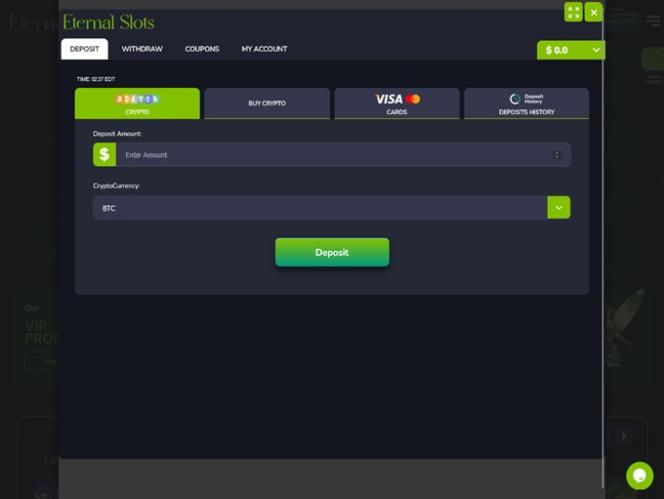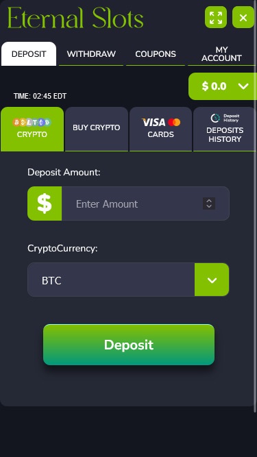 يُروّج كازينو إترنال سلوتس لخدماته وعلامته التجارية كأحد أفضل كازينوهات بيتكوين المتاحة. تجدر الإشارة إلى أنه بالإضافة إلى خيارات الدفع بالعملات المشفرة، يُمكن للمقامرين أيضًا إيداع الأموال باستخدام بطاقات الخصم والائتمان، بالإضافة إلى العديد من المحافظ الإلكترونية الأخرى.