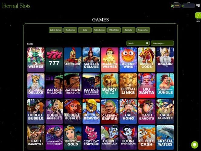 كما ذكرنا سابقًا، لا يضم كازينو إترنال سلوتس مكتبة ألعاب قمار ضخمة. هذا يعني أن مجموعة ألعاب القمار تُقدم عددًا محدودًا من العناوين المتاحة. مع ذلك، هذا لا يعني أن اللاعبين لن يتمكنوا من الاستمتاع بمحتوى ألعاب قمار عالي الجودة مُناسب للولايات المتحدة . تشمل مجموعة ألعاب الكازينو ألعاب القمار الكلاسيكية وأحدث إصدارات الألعاب، مع سمات شائعة متنوعة، ورسومات وصوتيات مذهلة، وغيرها الكثير.