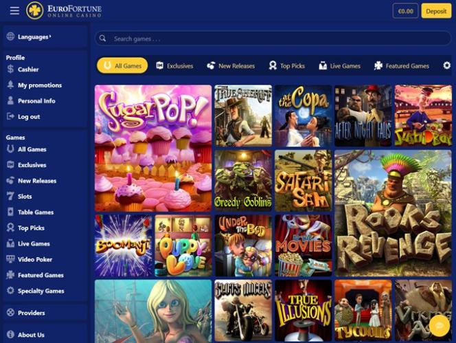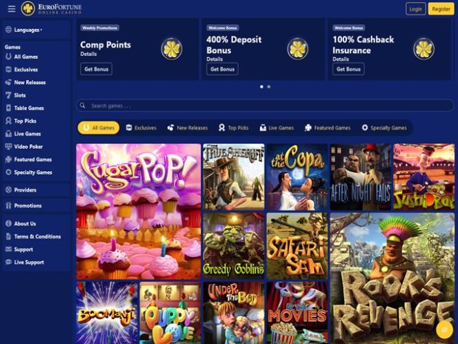 يتوفر في كازينو يوروفورتشن عدد كبير من ألعاب الفيديو والسلوتس الكلاسيكية. أكثرها إثارةً للإعجاب هي ألعاب بيتسوفت ثلاثية الأبعاد، بالإضافة إلى عدد كبير من الألعاب التقليدية. للأسف، تُضعف سياسات الدفع السيئة جوائز الكازينو التراكمية، والتي قد تصل قيمتها إلى مئات الآلاف.برنامج نقاط المنافسة