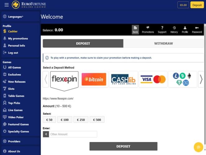 يتم تشغيل كازينو EuroFortune بواسطة Net Entertainment, BetSoft, iSoftBet, playson, Rival, Vivo Gaming, Arrows Edge, Wizard Games, Pariplay and Sandstorm ، ويمكن الوصول إلى ألعابه من خلال منصة تعتمد على الويب تتيح لك اللعب من خلال متصفح الويب الخاص بك.خيارات الخدمات المصرفية في EuroFortune