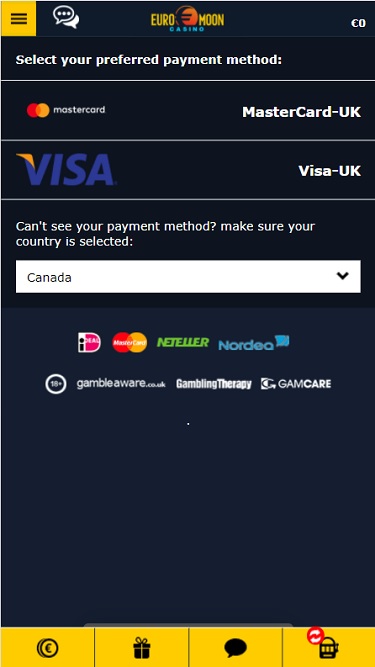 لا يقبل موقع Euromoon Casino اللاعبين من البلدان التالية: ألاباما, ألاسكا, أريزونا, أركنساس, أستراليا, بلغاريا, كاليفورنيا, كولورادو, كونيتيكت, دي سي, ديلاوير, إستونيا, فلوريدا, جورجيا, هاواي, أيداهو, إلينوي, إنديانا, أيوا, إسرائيل, كانساس, كنتاكي, كوريا، جمهورية كوريا الديمقراطية الشعبية, جمهورية كوريا, لويزيانا, مين, ماريلاند, ماساتشوستس, ميشيغان, مينيسوتا, ميسيسيبي, ميسوري, مونتانا, نبراسكا, هولندا, جزر الأنتيل الهولندية, نيفادا, نيو هامبشاير, نيوجيرسي, نيو مكسيكو, نيويورك, كارولينا الشمالية, داكوتا الشمالية, أوهايو, أوكلاهوما, أونتاريو, أوريغون, بنسلفانيا, رود آيلاند, روسيا, سنغافورة, كارولينا الجنوبية, داكوتا الجنوبية, تينيسي, تكساس, ديك رومى, الولايات المتحدة, يوتا, فيرمونت, فرجينيا, واشنطن, ولاية فرجينيا الغربية, ويسكونسن و وايومنغ.