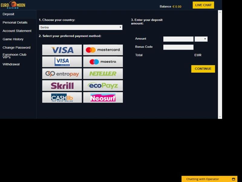 يتم تشغيل كازينو Euromoon بواسطة Net Entertainment, BetSoft, Evolution Gaming, Ezugi, playson, Rival, Thunderkick, Vivo Gaming, Yggdrasil, Booming Games, Stakelogic, Pragmatic Play, Red Tiger Gaming, ZEUS Services, IGT, Booongo, LuckyStreak, Felix Gaming, Inbet Games, Skillzzgaming, Kalamba, Nucleus Gaming, Spadegaming, BGAMING, Evoplay, SA Gaming, OneTouch, Pocket Games Soft, Triple PG, Bulletproof Games, Gluck Games, TVBet, Swintt, ThunderSpin, Super Spade Games, Mancala Gaming, SmartSoft Gaming, KA Gaming, Caleta Gaming, Ash Gaming, CT Interactive, GameScale, Push Gaming, Wager Gaming, Mr Slotty, Noble Gaming, Reflex Gaming, Apollo Games, RubyPlay, 4ThePlayer, AvatarUX, Gamevy, Groove Gaming, ReelPlay, Vibra Gaming, BB Games, Boomerang Studios, SimplePlay, Bang Bang Games, Gamzix, Triple Cherry, Dragon Gaming, Peter And Sons, Charismatic, Lotto Instant Win, Onlyplay, FastSpin, Dragoon Soft, Bombay Live, 3 Oaks Gaming, Bet2Tech and BetSolutions ، والذي يمكن الوصول إليه من خلال منصة تعتمد على الويب.خيارات الخدمات المصرفية في Euromoon Casino