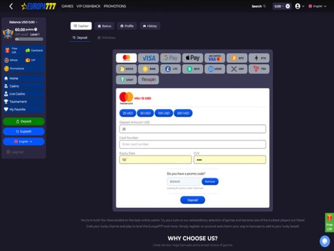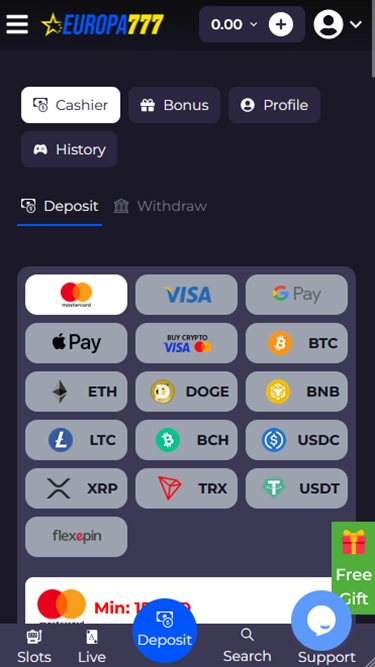 في Europa777، من الممكن إجراء عمليات الإيداع والسحب باستخدام العملات الورقية والعملات المشفرة، بما في ذلك العملات الرقمية الشهيرة مثل Bitcoin وBitcoin Cash وTron وEthereum وLitecoin وTether والمزيد.