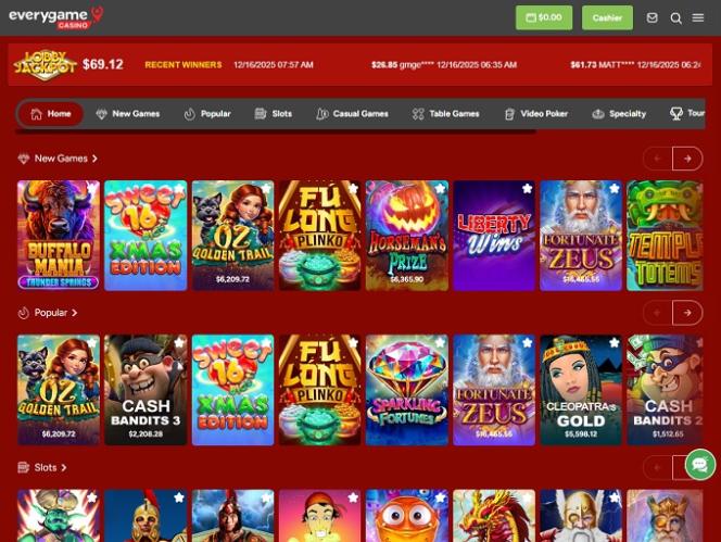 يتميز كازينو Everygame بمكتبة ألعاب منظمة بعناية ، ومنصة لعب سهلة الاستخدام وجذابة، مصممة وفقًا لأحدث معايير التكنولوجيا في سوق المقامرة عبر الإنترنت. يقبل هذا الكازينو الإلكتروني، المتوافق مع المعايير الأمريكية، العملات المشفرة، ويوفر منصة جوال مُحسّنة بالكامل، تتوافق تمامًا مع شاشات جميع الأجهزة المتاحة.