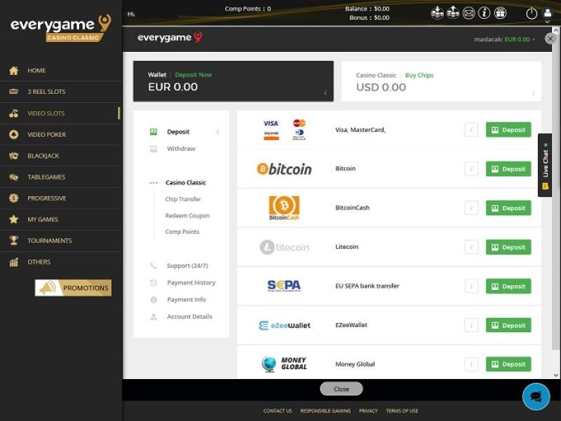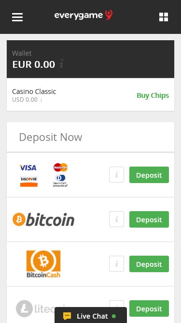 يقدم كازينو Everygame Classic عدة خيارات للدفع، بما في ذلك إيداع وسحب العملات المشفرة ، وبطاقات الائتمان والخصم والدفع المسبق، والمحافظ الإلكترونية والمزيد.