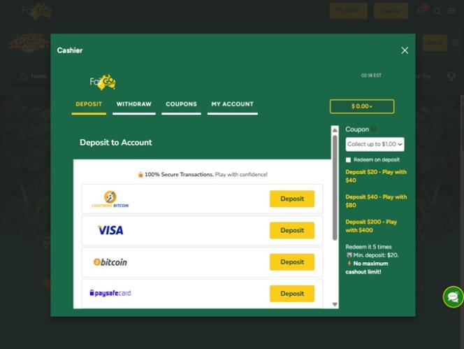 النظام المصرفي في Fair Go جيد، حيث يقبل الكازينو التحويلات البنكية، وبطاقات Visa، وBitcoin، وPaysafecard، وNeteller، وSkrill، وAmerican Express للإيداع والسحب. يُعدّ Bitcoin والمحافظ الإلكترونية أسرع طرق سحب أموالك، حيث يمكنك استلامها خلال يومين إلى ثلاثة أيام عمل. للأسف، يبلغ حد السحب الأسبوعي 2500 دولار أمريكي، وهو حد منخفض جدًا.