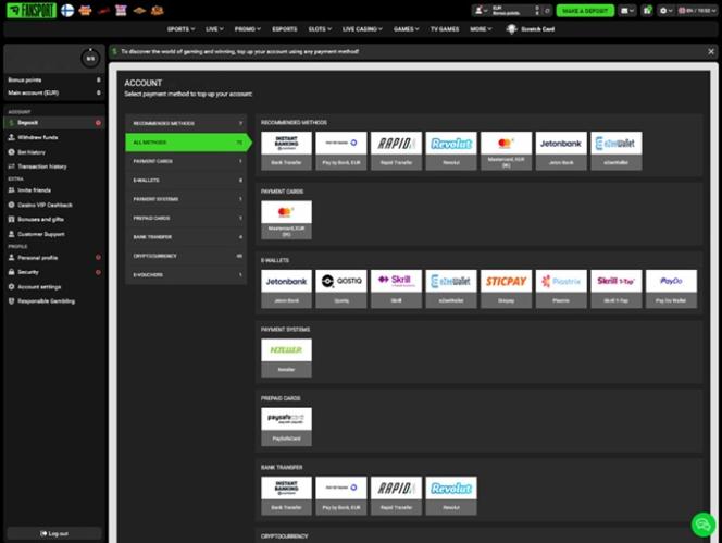 من أبرز ما يميز كازينو Fansport هو توفيره للاعبين العديد من طرق الدفع التقليدية والحديثة لإدارة أموالهم. من بين خيارات الدفع التقليدية: Visa و Mastercard و Bank Wire Transfer و Skrill و Neteller و Jeton و Neosurf وغيرها. في المقابل، تشمل خيارات الدفع الحديثة العملات المشفرة مثل Bitcoin و Bitcoin Cash و Cardano و Dash و Dogecoin و Polkadot و EOS و Ethereum و Litecoin و ZCash و Monero و Toncoin .