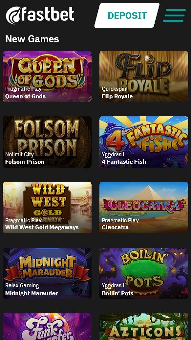 كازينو FastBet مدعوم بواسطة Microgaming, Net Entertainment, Barcrest, Big Time Gaming, ELK Studios, Evolution Gaming, iSoftBet, lightningboxgames, Play'n GO, Rabcat, Relax Gaming, Thunderkick, Yggdrasil, Pragmatic Play, Nolimit City, Red Tiger Gaming, Fantasma Games, Triple Edge Studios, Northern Lights Gaming, Stormcraft Studios, Electric Elephant Games, Gluck Games, Gameburger Studios, SpinPlay Games, Blue Guru Games, Games Global, Push Gaming, WMS, SG Interactive, Red7Mobile, Scientific Games, Foxium, Betdigital, Just For The Win, Storm Gaming Technology, Wild Streak Gaming, Fortune Factory Studios, Jade Rabbit Gaming, 4ThePlayer, AvatarUX, Gamevy, Alchemy Gaming, Hacksaw Gaming, Peter And Sons, Area Vegas, Print Studios and Reel Kingdom ، وتُقدم ألعاب الكازينو عبر منصة ويب يمكنك الوصول إليها من متصفح الإنترنت المفضل لديك. أعجبني تصميم الموقع، ووجدت سهولة في الوصول إلى القسم الذي أرغب باللعب فيه. كما يدعم FastBet اللعب عبر الهاتف المحمول بالكامل، مما يتيح لك المراهنة على هاتفك الذكي إذا رغبت.المقامرة المسؤولة ودعم العملاء والأمان