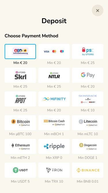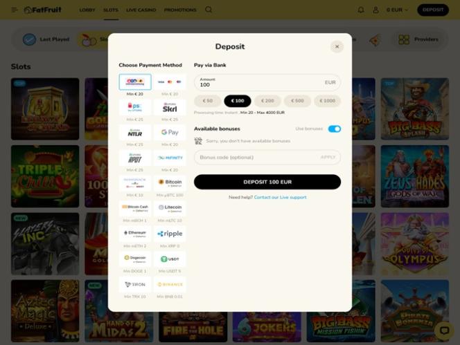 من الأمور التي نقدّرها بلا شك في كازينو FatFruit أنه يوفر للاعبين خيارات مصرفية متعددة للإيداع والسحب. تشمل طرق الدفع التقليدية Visa و Mastercard و Skrill و Neteller و Paysafecard و Google Pay و Apple Pay . في المقابل، تشمل الطرق الحديثة العملات المشفرة مثل Bitcoin و Bitcoin Cash و Cardano و Dogecoin و Litecoin و Ethereum و Tether و Ripple و Tron .