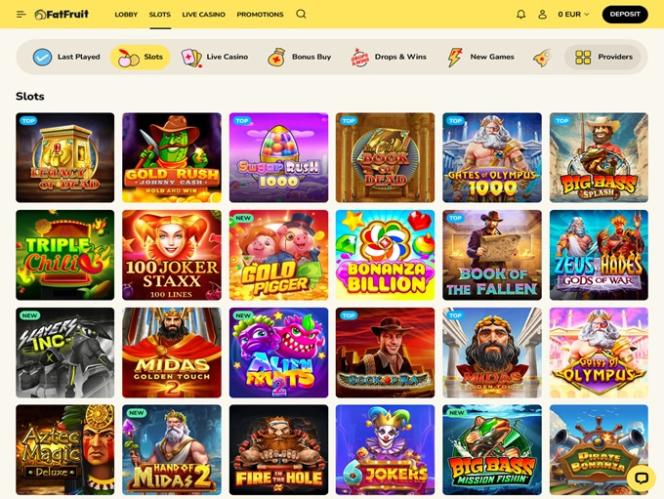 بدايةً، سيُسعد كازينو FatFruit اللاعبين بمكتبته الواسعة من الألعاب، حيث الخيارات واسعة جدًا. سواءً كنت من مُحبي ماكينات القمار بأموال حقيقية ، أو ألعاب الموزع المباشر ، أو ألعاب الطاولة عبر الإنترنت ، فإن الخيارات المتاحة أمامك مذهلة، وسيستغرق منك آلاف الساعات لتصفح جميع محتوياتها.
