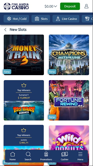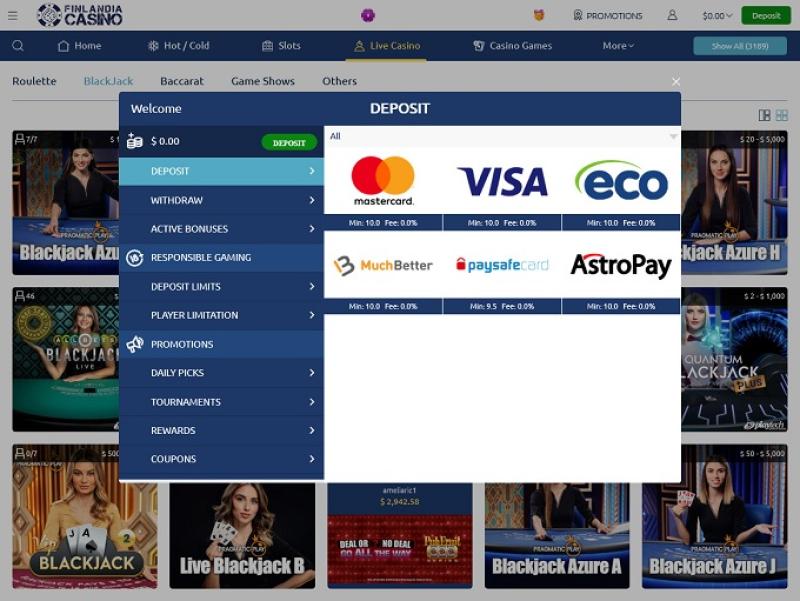 كازينو فنلندا مدعوم من Microgaming, Net Entertainment, Playtech, Real Time Gaming, Barcrest, Big Time Gaming, ELK Studios, Evolution Gaming, EYECON, Ezugi, lightningboxgames, Oryx, Play'n GO, Quickspin, Rabcat, Relax Gaming, Thunderkick, Yggdrasil, Realistic Games, Booming Games, Stakelogic, Pragmatic Play, Red Tiger Gaming, IGT, Kalamba, Triple Edge Studios, Northern Lights Gaming, Switch Studios, All41 Studios, Gameburger Studios, Games Global, Amusnet Interactive, 2by2 Gaming, Bally Technologies, Blueprint Gaming, Merkur Gaming, NextGen, NYX Interactive, Inspired Gaming, Cayetano, Gamomat, Authentic Gaming, Bally Wulff, Ganapati, Old Skool Studios, Foxium, Just For The Win, Golden Hero, Green Jade Games, STHLM Gaming, 4ThePlayer, High 5 Games and Peter And Sons ، وتُقدم ألعابه عبر منصة ويب، ما يعني أنك لستَ بحاجة إلى تنزيل أي برنامج لتجربة الألعاب. كما يتوفر موقع جوال لمن يرغب باللعب على أجهزتهم المحمولة.خيارات الخدمات المصرفية في Finlandia Casino