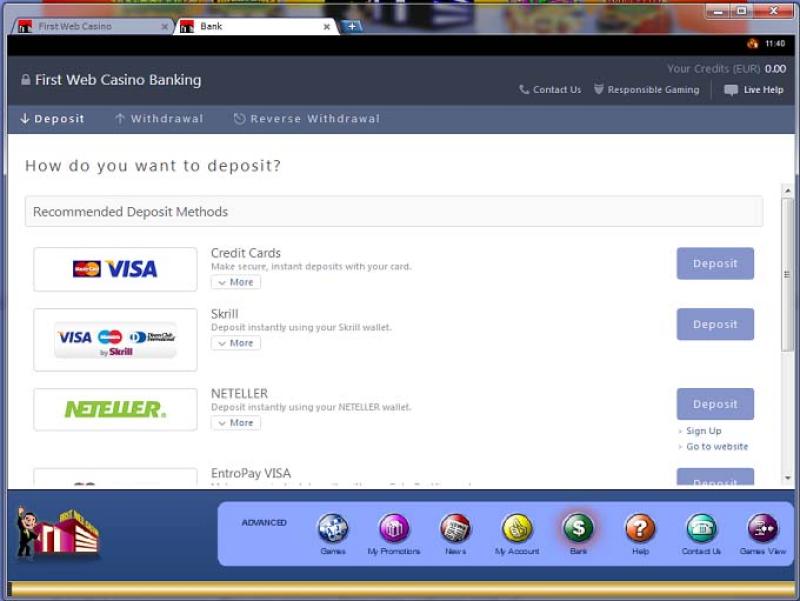 يعمل كازينو الويب الأول بواسطة Microgaming and Games Global ، مما يوفر للكازينو مكتبة تضم مئات الألعاب. يتوفر الكازينو عبر برنامج قابل للتنزيل، يُحمّل الألعاب مباشرةً على جهاز الكمبيوتر الخاص بك.خيارات الخدمات المصرفية في First Web Casino