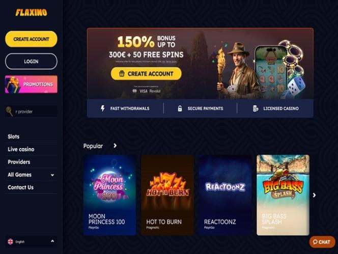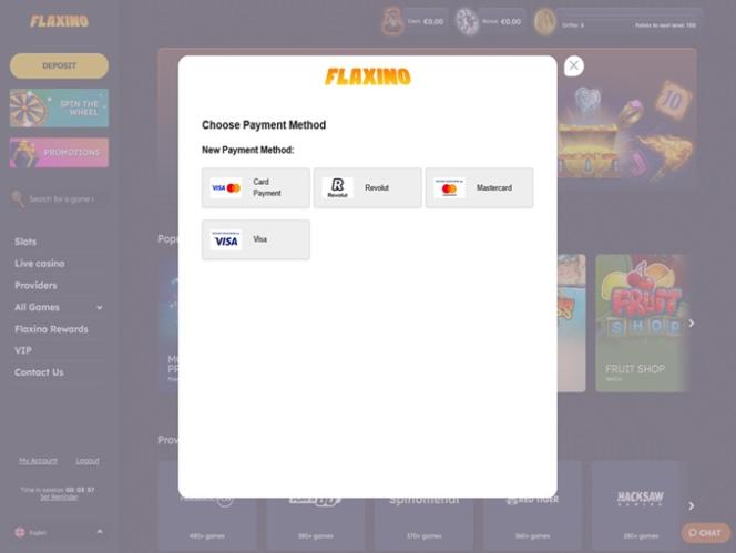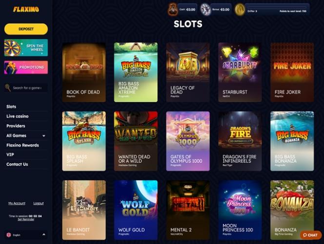 ستجد على الجانب الأيسر قائمة تحتوي على أقسام مثل الإيداع، وتدوير العجلة، وشريط البحث، وماكينات القمار، والكازينو المباشر، ومقدمي الخدمات، وجميع الألعاب، ومكافآت Flaxino، وVIP، وتواصل معنا.