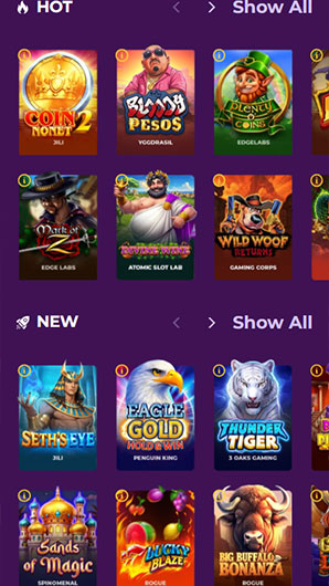 على سبيل المثال، يمكن للاعبين استكشاف مجموعة واسعة من الألعاب من بعض مطوري البرامج الأكثر تأثيرًا، بما في ذلك Net Entertainment, Big Time Gaming, Habanero Systems, Novomatic, playson, Relax Gaming, Yggdrasil, Realistic Games, Arrows Edge, Booming Games, Booongo, Spinomenal, Red Rake Gaming, Fantasma Games, Kalamba, Revolver Gaming, Platipus Gaming, Spinmatic, BGAMING, Evoplay, Gluck Games, Mascot Gaming, Swintt, Mancala Gaming, Expanse Studios, KA Gaming, FilsGame, Greentube, Proprietary, RubyPlay, 4ThePlayer, Gamevy, NetGaming, Hacksaw Gaming, Max Win Gaming, Gamzix, Slotmill, Onlyplay, ELA Games, 3 Oaks Gaming, Jili, Print Studios, Gaming Corps, Four Leaf Gaming, Atomic Slot Lab, Indigo Magic, Popiplay, Playzia, ICONIC21, Formula Spin, Slotopia, Galaxsys, Turbo Games, Penguin King and ESA Gaming .