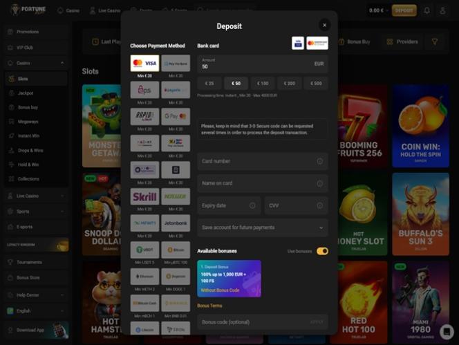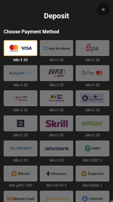 سيتمكن اللاعبون من الاختيار من بين خيارات الدفع المستخدمة على نطاق واسع مثل بطاقات الخصم والائتمان، والمحافظ الإلكترونية الشهيرة مثل Skrill و Neteller ، والتحويلات المصرفية المباشرة، وأنظمة الدفع عبر الإنترنت الأخرى التي تجعل عمليات الإيداع والسحب سريعة وسهلة.