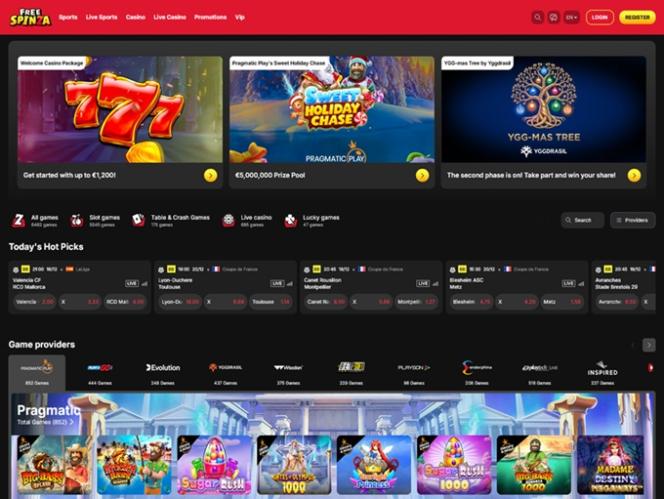 Free Spinza هو كازينو حديث على الإنترنت يقدم مجموعة شاملة من ألعاب الكازينو، مثل ماكينات القمار بأموال حقيقية، وألعاب الموزعين المباشرين، وألعاب الطاولة، وألعاب الاختراق، بالإضافة إلى قسم مراهنات رياضية فعّال. يقبل الكازينو لاعبين من ألمانيا والنمسا وفنلندا والسويد وهولندا، ويضمن لهم تجربة لعب رائعة مع ألعاب وعروض ترويجية ومكافآت.