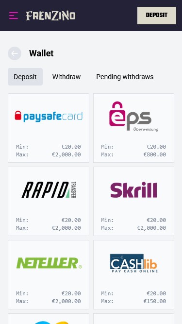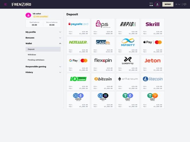 إذا كنت تستمتع باستخدام العملات المشفرة للإيداع والسحب، فسيسعدك أن تعلم أن Frenzino يقبل عملات متعددة مثل Bitcoin و Ethereum و USDT.