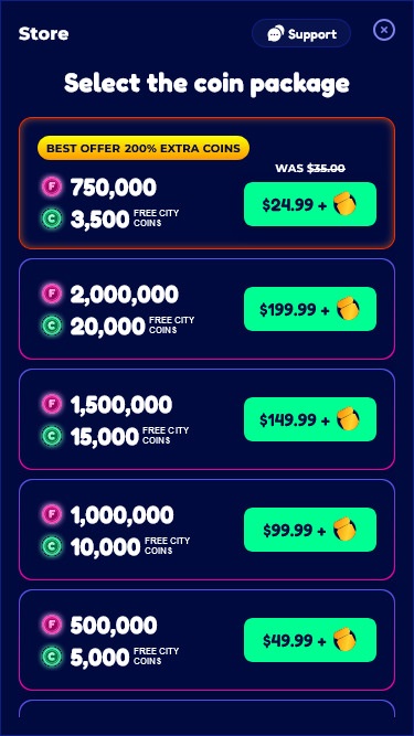 - لا يمكن شراء عملات المدينة؛ بل يمكن توزيعها مجانًا عبر حزم العملات الذهبية أو طرق بديلة.