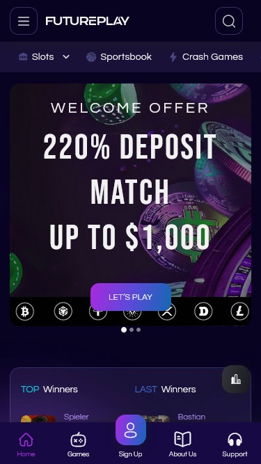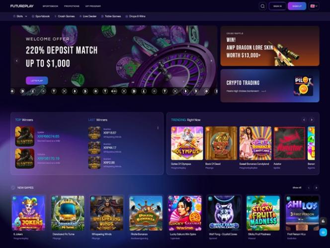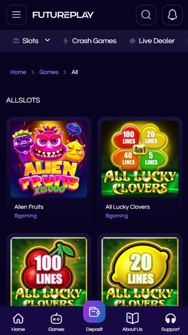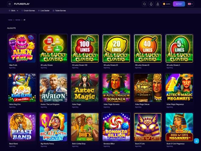 يعمل الكازينو على منصة ذات واجهة رائعة. يُضفي اللون الأزرق الداكن الجميل جوًا رائعًا، بينما يُميزه مظهره الأنيق عن منافسيه. في سوق بهذا الحجم، تلعب جودة مكتبة الألعاب دورًا هامًا. يُعزز كازينو Futureplay شراكاته مع أفضل استوديوهات الألعاب، مُقدمًا للاعبين آلاف الألعاب.