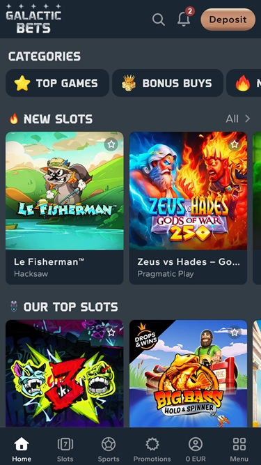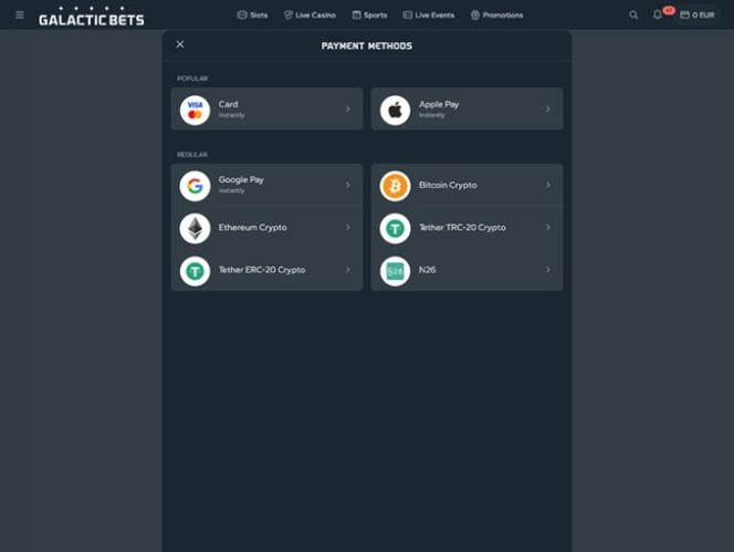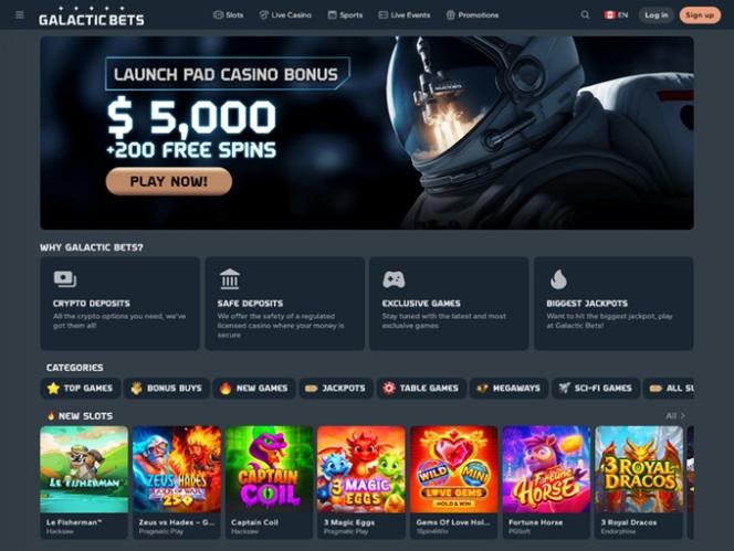 جالاكتيك بيتس هو كازينو إلكتروني يقدم مكتبة ضخمة من ألعاب الكازينو، تشمل آلاف ماكينات القمار بأموال حقيقية، وألعاب الموزعين المباشرين، وألعاب الطاولة، وألعاب الحظ، بالإضافة إلى قسم ضخم للمراهنات الرياضية. كما يقدم الكازينو العديد من العروض الترويجية والمكافآت، ويدعو اللاعبين من ألمانيا والنمسا وسويسرا وأستراليا وكندا لتجربته!