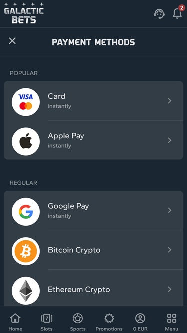 للارتقاء بجلسات اللعب إلى مستوى جديد، صممت GalacticBets خطة ترويجية مميزة تتضمن العديد من المكافآت والعروض الترويجية والفعاليات التي يمكنك المشاركة فيها. يمكن للاعبين الحصول على مكافأة الترحيب، وكسب استرداد نقدي أسبوعي، واستلام مكافآت الولاء، أو الحصول على مكافآت إعادة الشحن طوال فترة لعبهم.