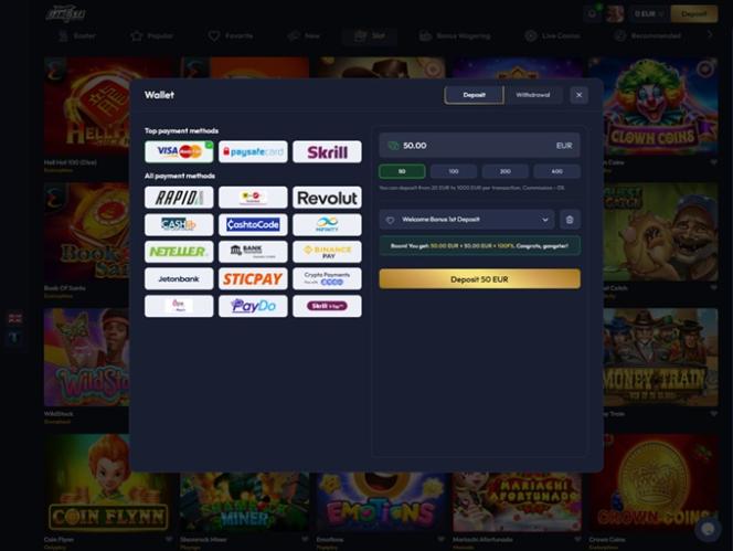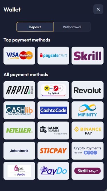 كما ذكرنا سابقًا، هذه علامة تجارية للمقامرة عبر الإنترنت تدعم العملات المشفرة. فبالإضافة إلى التحويل البنكي، وطرق الدفع الشائعة مثل بطاقات الخصم والائتمان، والمحافظ الإلكترونية، يمكن للمقامرين استخدام مجموعة متنوعة من العملات المشفرة الرائجة، والتي عادةً ما تتميز بسرعة معالجة المعاملات.