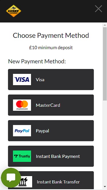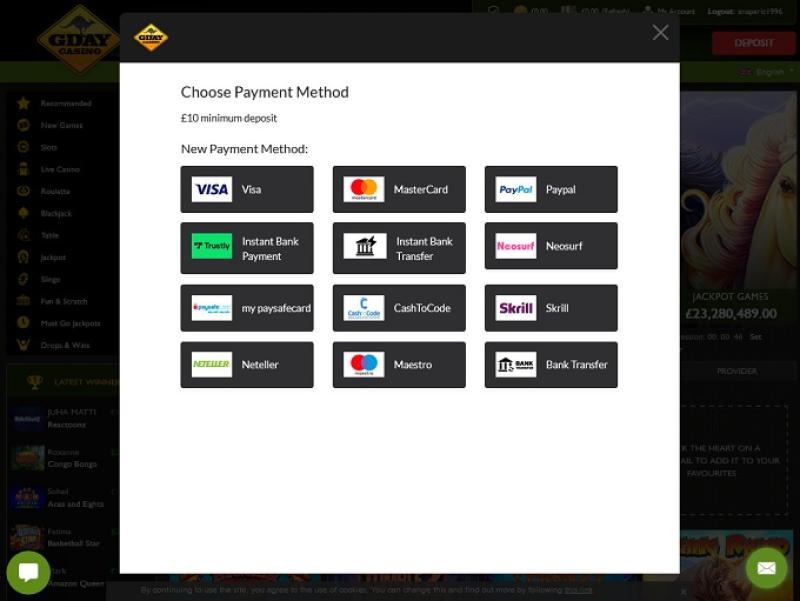 يعمل كازينو G'Day بواسطة Microgaming, Net Entertainment, 1x2gaming, Barcrest, Big Time Gaming, ELK Studios, Evolution Gaming, EYECON, Ezugi, Genesis Gaming, lightningboxgames, Play'n GO, Quickspin, Rabcat, Relax Gaming, Endorphina, Realistic Games, Pragmatic Play, Nolimit City, Felt Gaming, Red Tiger Gaming, Skillzzgaming, Fantasma Games, ReelNRG, FUGA Gaming, Kalamba, Revolver Gaming, Sigma Gaming, Concept Gaming, Northern Lights Gaming, Electric Elephant Games, Pocket Games Soft, Bulletproof Games, All41 Studios, Gameburger Studios, Pulse 8 Studios, Neon Valley Studios, Golden Rock Studios, HungryBear Gaming, GONG Gaming, On Air Entertainment, Buck Stakes Entertainment, Games Global, 2by2 Gaming, Ainsworth, Bally Technologies, Blueprint Gaming, Endemol Games, Games Warehouse, Greentube, Leander Games, Merkur Gaming, multicommerce, NYX Interactive, Probability, Push Gaming, Inspired Gaming, Cayetano, SG Interactive, Red7Mobile, CORE Gaming, Authentic Gaming, Iron Dog Studio, Old Skool Studios, Foxium, Betdigital, Just For The Win, Reflex Gaming, Bla Bla Bla Studios, MetaGU, PearFiction Studios, Apollo Games, Fortune Factory Studios, Jade Rabbit Gaming, Green Jade Games, 4ThePlayer, Crazy Tooth Studio, High 5 Games, Mutuel Play, Pirates Gold Studios, SGS Universal, Alchemy Gaming, BB Games, Black Pudding Games, Hacksaw Gaming, Max Win Gaming, Gold Coin Studios, Half Pixel Studios, SilverBack Gaming, Eurostar Studios, Armadillo Studios, Lucksome Gaming, RAW iGaming and Leap Gaming ، مما يمنحه مكتبة ألعاب ضخمة تضم عشرات العناوين. يُمكن الوصول إلى الكازينو عبر منصة ويب، ما يعني إمكانية اللعب مباشرةً عبر متصفح الويب. كما يوفر الكازينو موقعًا للهواتف المحمولة لمن يرغبون في اللعب عبر هواتفهم الذكية وأجهزتهم اللوحية.خيارات الخدمات المصرفية في G'Day Casino