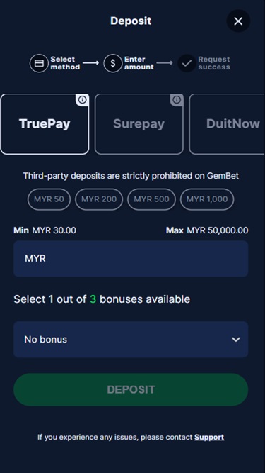فيما يتعلق بطرق الدفع، لا يوفر كازينو GemBet خيارات شاملة للاعبيه. يمكنك إيداع وسحب الأموال عبر التحويلات البنكية التي توفرها خيارات SurePay وPayNow وTruePay المصرفية. بالإضافة إلى ذلك، يقبل الموقع عملة Tether كوسيلة الدفع الوحيدة المتاحة للعملات المشفرة.