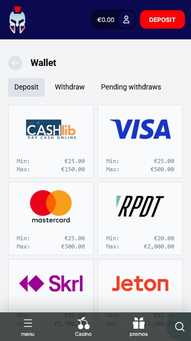 عند النظر إلى اليمين، ستجد زر الإيداع، وزر الملف الشخصي، ورصيد الحساب، بالإضافة إلى خيارات لتغيير اللغة وزر لفتح الدردشة المباشرة. كما يوجد بالطبع زر البحث، الذي يفتح شريط البحث، مما يتيح لك العثور بسرعة على ألعابك أو مزودي الخدمة أو الفئات المفضلة لديك!