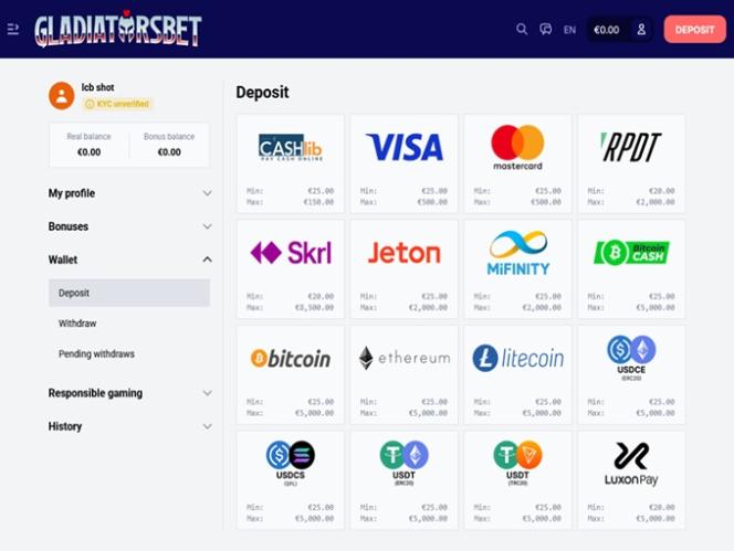 إذا كنت تعتبر نفسك من عشاق العملات المشفرة، فسيسعدك أن تعلم أن GladiatorsBet تقدم خدماتها في هذا الصدد أيضًا، حيث تقبل عددًا كبيرًا من العملات المشفرة المختلفة، بما في ذلك Bitcoin و Litecoin .
