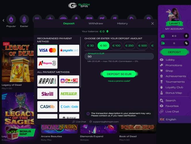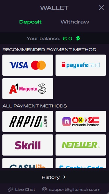 قسم المدفوعات في GlitchSpin مليء بطرق الإيداع والسحب الشائعة. تذكر دائمًا التحقق من الخيارات المتاحة في منطقتك، فهي تختلف باختلاف البلد. ولكن بغض النظر عن مكان وصولك إلى هذا الكازينو، سيتوفر للاعبين مجموعة واسعة من طرق الدفع - بدءًا من بطاقات الائتمان والخصم والتحويلات المصرفية المباشرة، وصولًا إلى المحافظ الإلكترونية الشهيرة مثل Skrill و Revolut وNeteller، بالإضافة إلى خيارات دفع بالعملات المشفرة والعملات الرقمية الرائجة مثل Bitcoin وBitcoin Cash وDogecoin وTron وTether وEthereum وغيرها.