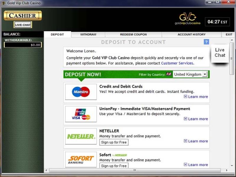 يتم تشغيل كازينو Gold VIP Club بواسطة Real Time Gaming ، والذي يمنح اللاعبين إمكانية الوصول إلى مكتبته من خلال برنامج قابل للتنزيل أو من خلال منصة تعتمد على الويب.خيارات الخدمات المصرفية في Gold VIP Club
