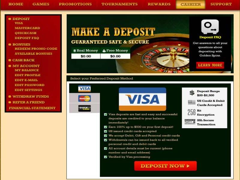 كازينو جولدن سبينز مدعوم من BetSoft, Parlay Entertainment and Proprietary ، وتُقدم الألعاب عبر منصة ويب تتيح لك اللعب عبر متصفح الإنترنت. كما يوفر الكازينو موقعًا إلكترونيًا للهواتف الذكية والأجهزة اللوحية.خيارات الخدمات المصرفية في Golden Spins