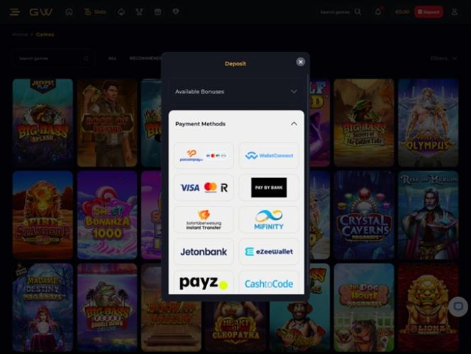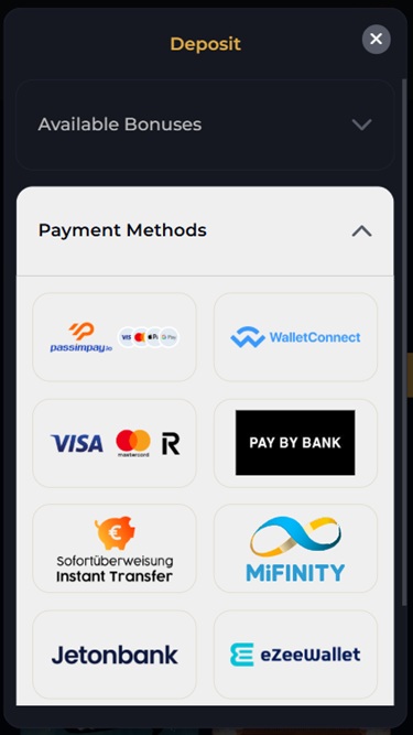 طرق الدفع المتاحة للاعبين هي: البطاقات المدفوعة مسبقًا، والخصم والائتمان، ومدفوعات المحفظة الإلكترونية، والخدمات المصرفية الفورية، والتحويلات المصرفية.