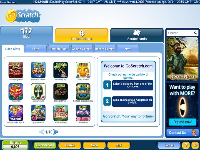 يُقدّم كازينو GoScratch مجموعةً واسعةً من ماكينات القمار، حيث يُقدّم عشراتٍ من ماكينات القمار المرئية ومجموعةً واسعةً من الألعاب الكلاسيكية. كما يُمكن للمقامرين الفوز بجوائز كبرى تصاعدية كبيرة، تتراوح قيمتها بين بضعة آلاف وبضعة ملايين من الدولارات.برنامج نقاط المنافسة