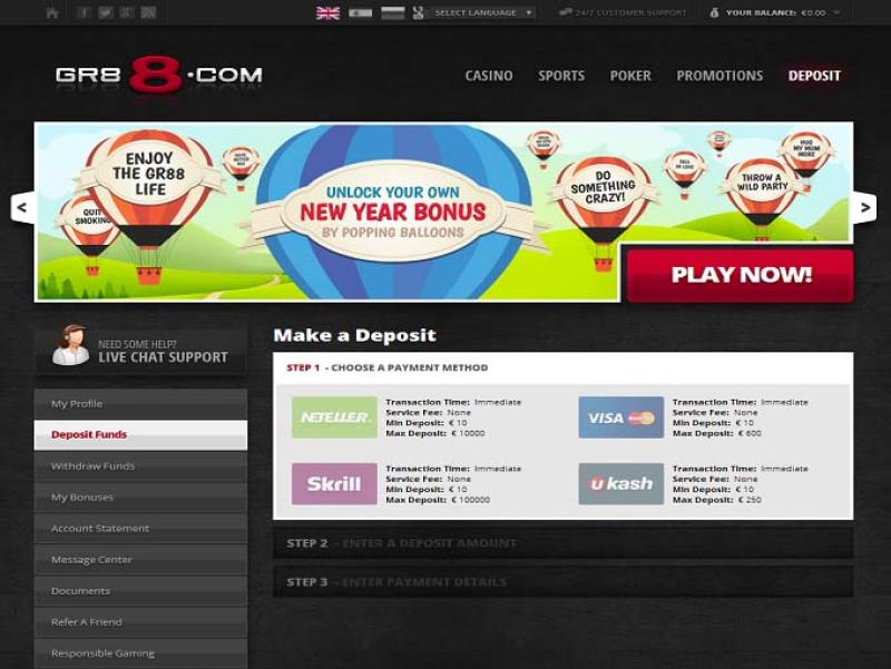 كازينو GR88 مدعوم بـ Microgaming, Big Time Gaming, Genesis Gaming, Play'n GO, Quickspin, Rabcat, Games Global, Games Warehouse and Leander Games ، مما يوفر له مكتبة ضخمة من الألعاب. يُمكن الوصول إلى الكازينو عبر منصة ويب.خيارات الخدمات المصرفية في GR88