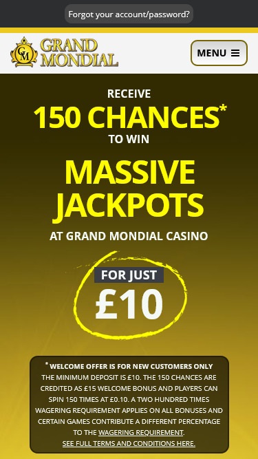 لا يقبل موقع Grand Mondial اللاعبين من البلدان التالية: أفغانستان, ألاباما, ألاسكا, ساموا الأمريكية, أريزونا, أركنساس, أستراليا, بيلاروسيا, بلجيكا, بوتسوانا, كاليفورنيا, جمهورية أفريقيا الوسطى, الصين, كولورادو, الكونغو, جمهورية الكونغو الديمقراطية, كونيتيكت, قبرص, دي سي, ديلاوير, الدنمارك, إريتريا, فلوريدا, فرنسا, جورجيا, ألمانيا, اليونان, غوام, غينيا, هاواي, هونغ كونغ, هنغاريا, أيداهو, إلينوي, إنديانا, أيوا, إيران, العراق, إيطاليا, كانساس, كنتاكي, كوريا، جمهورية كوريا الديمقراطية الشعبية, ليبيريا, ليبيا, ليتوانيا, لويزيانا, مين, مالطا, ماريلاند, ماساتشوستس, ميشيغان, مينيسوتا, ميسيسيبي, ميسوري, مونتانا, نبراسكا, هولندا, نيفادا, نيو هامبشاير, نيوجيرسي, نيو مكسيكو, نيويورك, كارولينا الشمالية, داكوتا الشمالية, جزر ماريانا الشمالية, النرويج, أوهايو, أوكلاهوما, أوريغون, باكستان, بنسلفانيا, فيلبيني, بولندا, البرتغال, بورتوريكو, رود آيلاند, رومانيا, روسيا, سانت مارتن, سنغافورة, الصومال, جنوب أفريقيا, كارولينا الجنوبية, داكوتا الجنوبية, إسبانيا, السودان, السويد, سويسرا, سوريا, تايوان, تينيسي, تكساس, الولايات المتحدة, يوتا, فيرمونت, جزر فيرجن البريطانية, جزر فيرجن الأمريكية, فرجينيا, واشنطن, ولاية فرجينيا الغربية, ويسكونسن, وايومنغ و زيمبابوي.