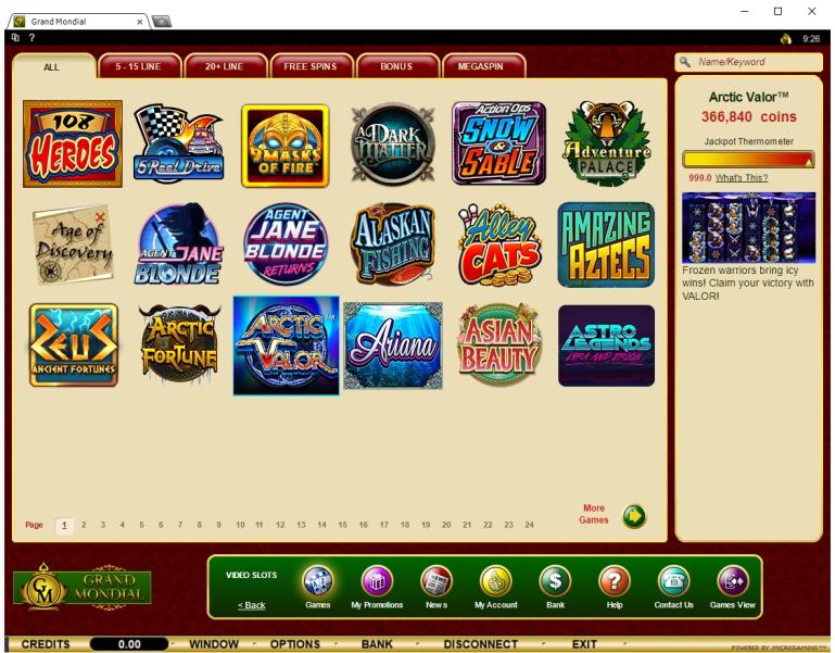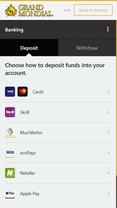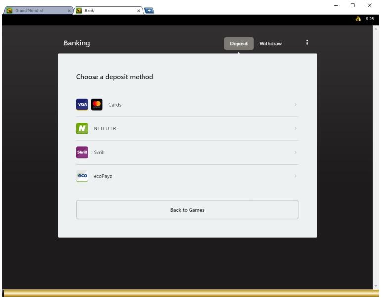 كازينو جراند مونديال مدعوم من Microgaming, Rabcat, Triple Edge Studios, Northern Lights Gaming, Stormcraft Studios, Switch Studios, Electric Elephant Games, All41 Studios, Gameburger Studios, Pulse 8 Studios, Neon Valley Studios, SpinPlay Games, Real Dealer Studios, GONG Gaming, On Air Entertainment, Buck Stakes Entertainment, Games Global, Old Skool Studios, Foxium, Just For The Win, PearFiction Studios, Slingshot Studios, Fortune Factory Studios, Crazy Tooth Studio, Alchemy Gaming, Snowborn Games, Gold Coin Studios, Half Pixel Studios, Eurostar Studios and Aurum Signature Studios ، الذي يوفر مئات الألعاب عبر برنامج ويب وبرنامج قابل للتنزيل. كما يتوفر للاعبين خيار مراهنة عبر الهاتف المحمول، والذي يمكن استخدامه على الهواتف الذكية والأجهزة اللوحية.خيارات الخدمات المصرفية في Grand Mondial