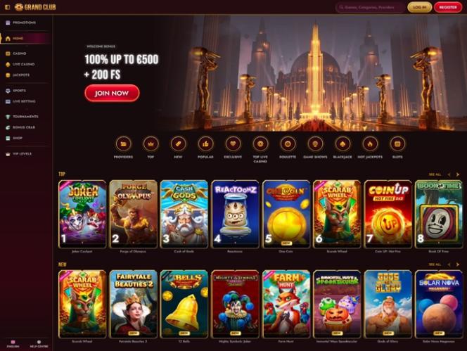 كازينو جراند كلوب مرخص ومنظم من قبل حكومة الفلبين. عند دخولك الموقع لأول مرة، سيجد اللاعبون بيئةً أنيقةً وجذابةً تُكمل اسم العلامة التجارية. كل شيء يبدو فخمًا وجذابًا، مع لوحة ألوان ذهبية جذابة، مما يجعل اللاعبين يشعرون وكأنهم جزء من نادٍ مميز للغاية.