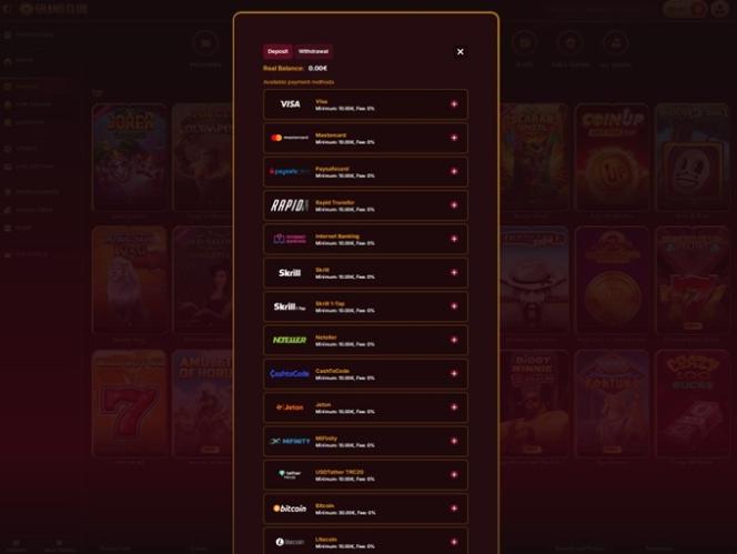 يسعدنا أن لاعبي كازينو جراند كلوب يمكنهم إجراء عمليات الإيداع والسحب باستخدام طرق دفع متعددة، بما في ذلك العملات المشفرة مثل بيتكوين، ودوجكوين، ولايتكوين، وتيثر . تشمل خيارات الدفع التقليدية بطاقات الائتمان والمحافظ الإلكترونية مثل فيزا ، وماستركارد ، ومي فينيتي ، وجيتون ، ونتلر ، وسكريل ، والتحويلات البنكية .