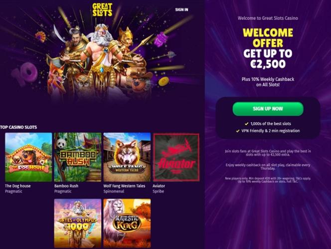 كازينو Greats Slots هو موقع للمقامرة يُقدم ما يوحي به اسمه تمامًا: مجموعة هائلة من ألعاب السلوتس الإلكترونية التي تُتيح للاعبين فرصة الاستمتاع بها. بالإضافة إلى ذلك، يُقدم الكازينو تشكيلة مميزة من ألعاب الموزعين المباشرين وألعاب الطاولة، إلى جانب باقة رائعة من العروض الترويجية والمكافآت. ويستقبل الكازينو لاعبين من أستراليا والمملكة المتحدة وفرنسا.