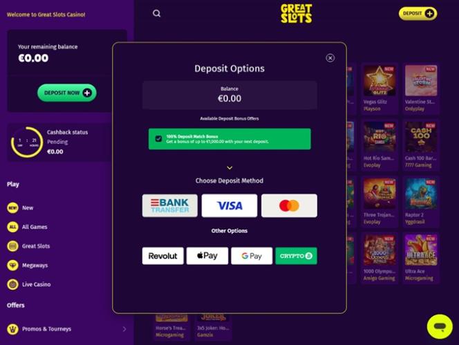 أما فيما يتعلق بالعروض الترويجية والمكافآت القياسية، فقد لا يقدم كازينو Great Slots تشكيلة واسعة من المكافآت، لكن ما هو متاح منها يستحق الاستفادة منه بلا شك. أولاً وقبل كل شيء، تجدر الإشارة إلى أن كل لاعب جديد سيُطلب منه الحصول على باقة ترحيبية سخية تتضمن العديد من عروض مطابقة الإيداع.