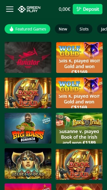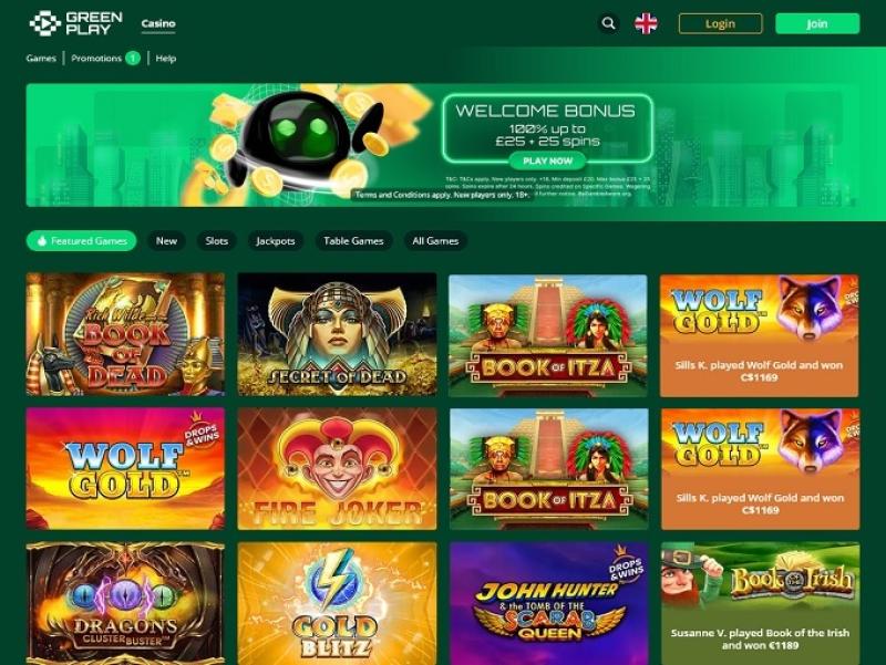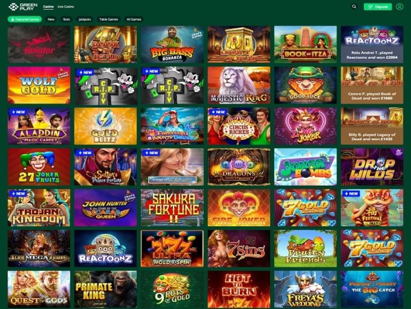 فئات الألعاب في Greenplay هي: الألعاب المميزة، والجديدة، والفتحات، والجوائز الكبرى، وألعاب الطاولة وجميع الألعاب.