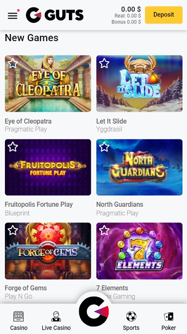 من أهم مزايا Guts هي مجموعتها الواسعة من الألعاب، التي تقدمها Microgaming, Net Entertainment, BetSoft, 1x2gaming, Barcrest, Big Time Gaming, ELK Studios, Evolution Gaming, Genesis Gaming, iSoftBet, lightningboxgames, Novomatic, Oryx, Play'n GO, Quickspin, Relax Gaming, Thunderkick, Yggdrasil, Endorphina, Wazdan, Stakelogic, Pragmatic Play, Nolimit City, Red Tiger Gaming, Skillzzgaming, Fantasma Games, FunFair, Kalamba, Triple Edge Studios, Concept Gaming, Stormcraft Studios, Pocket Games Soft, All41 Studios, Gameburger Studios, Neon Valley Studios, Golden Rock Studios, Spearhead Studios, SpinPlay Games, Games Global, 2by2 Gaming, Bally Technologies, bluberi, Blueprint Gaming, Greentube, NextGen, NYX Interactive, Push Gaming, WMS, Inspired Gaming, Spigo, SG Interactive, Red7Mobile, Scientific Games, Reel Time Gaming, Authentic Gaming, Foxium, Just For The Win, PearFiction Studios, Wild Streak Gaming, Slingshot Studios, Fortune Factory Studios, 4ThePlayer, AvatarUX, High 5 Games, ReelPlay, Alchemy Gaming, Snowborn Games, Hacksaw Gaming, Max Win Gaming, Gold Coin Studios, Bang Bang Games, Slotmill, SilverBack Gaming, Eurostar Studios, Aurum Signature Studios, Lucksome Gaming, Area Vegas, Kitsune Studios, Sneaky Slots, Penguin King and Octoplay . عند النظر إلى جميع مطوري الألعاب، ستجد أن Guts تقدم مئات الألعاب للاعبيها. تتراوح هذه الألعاب بين ماكينات القمار وألعاب الطاولة وألعاب الفيديو بوكر وألعاب الأركيد.المقامرة المسؤولة ودعم العملاء والأمان