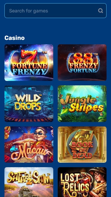 بالإضافة إلى ألعاب الكازينو المباشرة وألعاب ماكينات القمار، يمكن للمقامرين تجربة الرياضات الافتراضية عبر الإنترنت (الدوري الألماني - حسب الطلب، سباق الخيل، الخيول 10 المسطحة، كأس أوروبا، مباراة الدوري الإيطالي السريع لكرة القدم....)، بالإضافة إلى: Battleship، Motor Bikes، Spin 2 Win Royale، Wheel of Steal، Wacky Waves، Keno ، Keno Deluxe، Spin 2 Win، Neon Shapes، Save the Hamster، Mysteries of the East، Horror House، Xmas Keno Cat، Game Changer، The Incredible Balloon Machine...