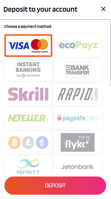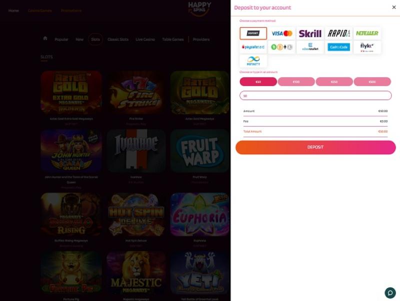 يوفر HappySpins مجموعة واسعة من طرق الدفع للإيداع والسحب: طرق العملات المشفرة، وبطاقات الدفع، والقسائم، والمحافظ الإلكترونية، والتحويلات المصرفية الفورية.